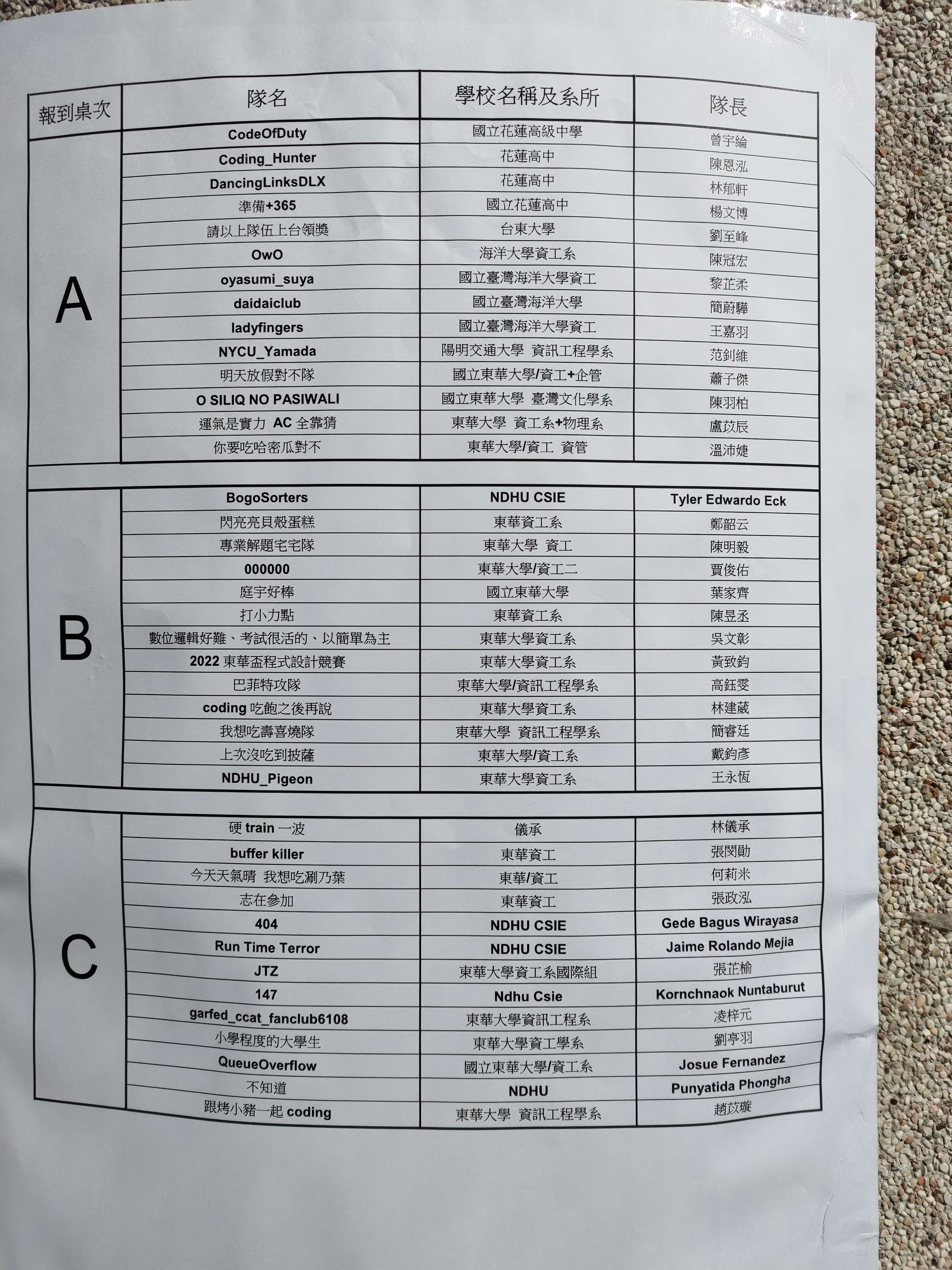 參加比賽的隊伍比想像中少了一大截,特別是高中組,去年還有 9 隊,今年直接只剩下被我推坑的 4 隊學弟們。雖然官網上寫說不足 6 隊將不會舉辦高中組,但看起來還是傲嬌地辦了呢~
