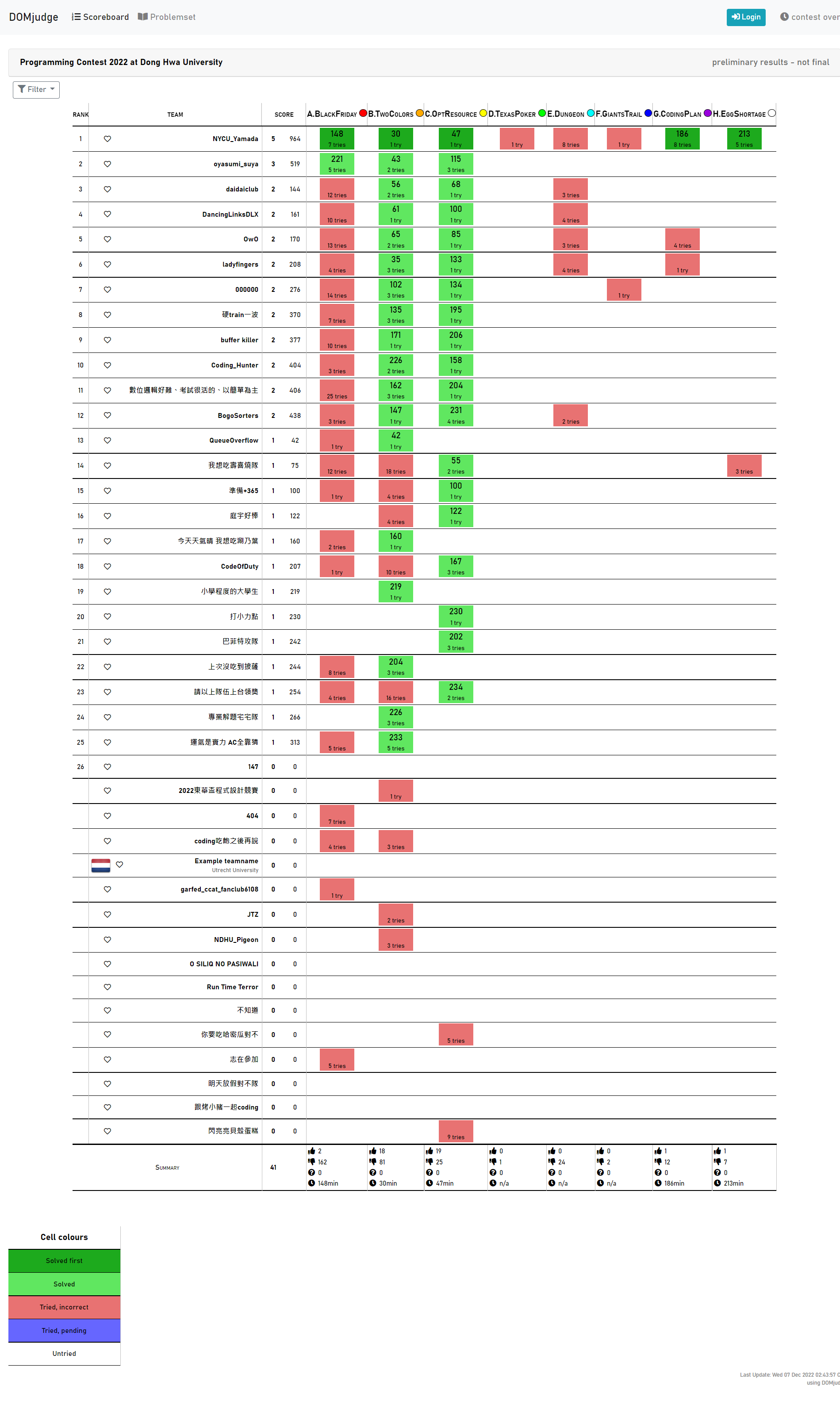 很開心的是學弟們在我在報名期限最後一天推薦之後還有來報名,去年還有好幾所高中組了九隊,今年直接只有花中的四隊包下了全部的高中組獎金(希望這套題目不會讓他們不想打競程 QQ)。