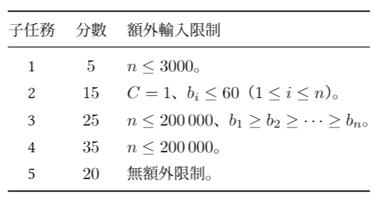 上午八點半,我在寫最後一個子題,突然就意識到:\(b_1 \ge b_2 \ge \cdots \ge b_n\) 有 \(b_i = b_{i+1}\) 的情況也要特殊處理,那麼那個子題到 AC 的難度區間是不是太小了?就把 \(n \le 3000\) 跟 \(b_1 \ge b_2 \ge \cdots \ge b_n\) 的配分都提高了一些,並把限制從非嚴格遞減改成嚴格遞減。