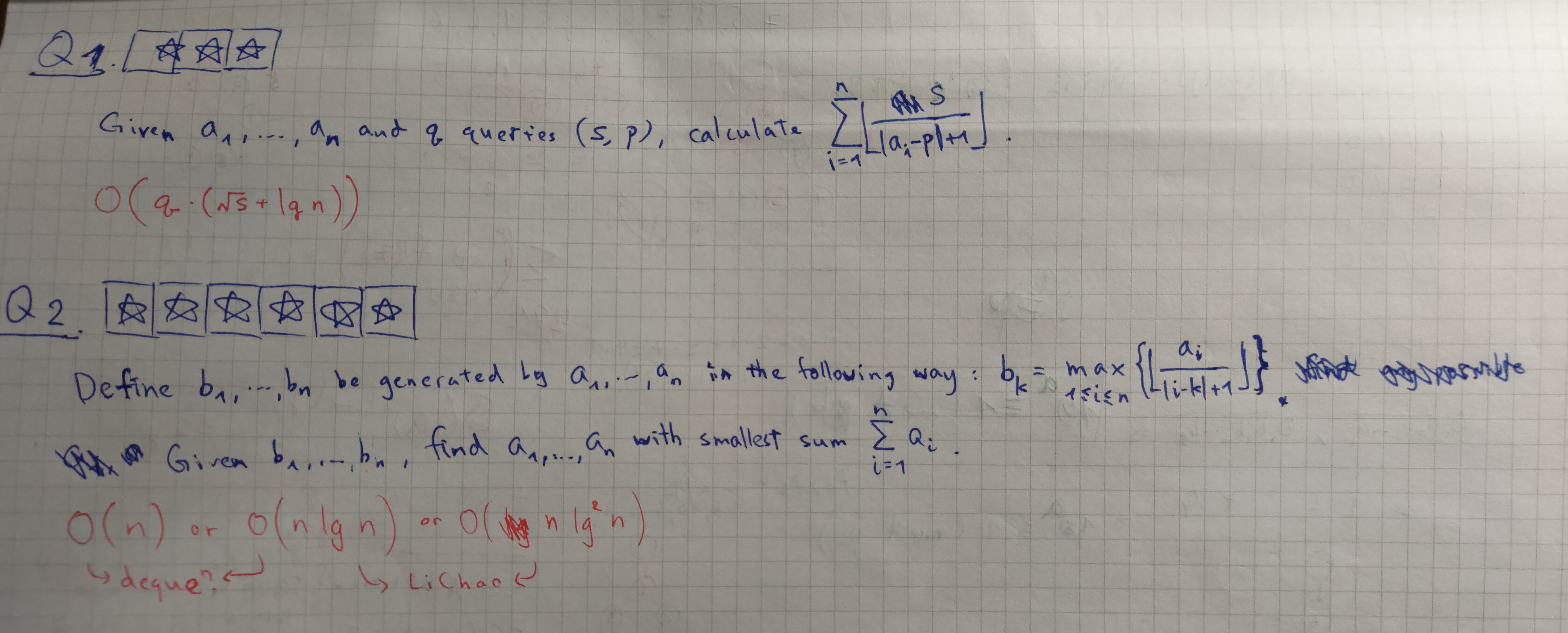 當下我就試著看能解到什麼程度:首先是先發現了她有個看起來就很對的 greedy 性質,接著畫了一下又 claim 她有優超性,這時我確定這題用李超線段樹就做到 \(\mathcal{O}(n \lg^2 n)\) 或是 \(\mathcal{O}(n \lg n)\),但我不確定 convex-hull trick 能不能處理優超性函數,所以 deque 的解被我畫了個問號。